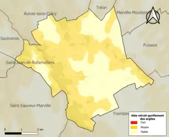 Le retrait-gonflement des sols argileux est susceptible d'engendrer des dommages importants aux bâtiments en cas d’alternance de périodes de sécheresse et de pluie. 59,7 % de la superficie communale est en aléa moyen ou fort (52,8 % au niveau départemental et 48,5 % au niveau national). Sur les 126 bâtiments dénombrés sur la commune en 2019, 59 sont en aléa moyen ou fort, soit 47 %, à comparer aux 70 % au niveau départemental et 54 % au niveau national. Une cartographie de l'exposition du territoire national au retrait gonflement des sols argileux est disponible sur le site du BRGM[15],[Carte 2].
