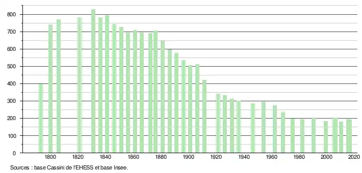 L'évolution du nombre d'habitants est connue à travers les recensements de la population effectués dans la commune depuis 1793. Pour les communes de moins de 10 000 habitants, une enquête de recensement portant sur toute la population est réalisée tous les cinq ans, les populations de référence des années intermédiaires étant quant à elles estimées par interpolation ou extrapolation[7]. Pour la commune, le premier recensement exhaustif entrant dans le cadre du nouveau dispositif a été réalisé en 2005[8].