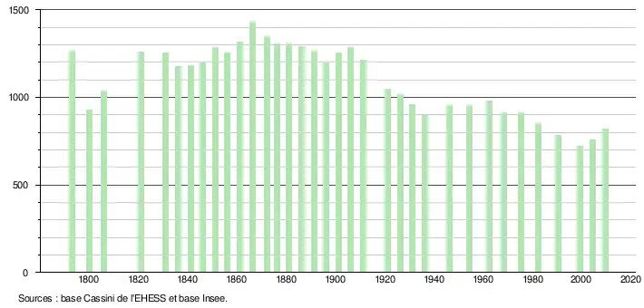 - ↑ Par convention dans Wikipédia, le principe a été retenu de n’afficher dans le tableau des recensements et le graphique, pour les populations légales postérieures à 1999, que les populations correspondant à une enquête exhaustive de recensement pour les communes de moins de 10 000 habitants, et que les populations des années 2006, 2011, 2016, etc. pour les communes de plus de 10 000 habitants, ainsi que la dernière population légale publiée par l’Insee pour l'ensemble des communes.
