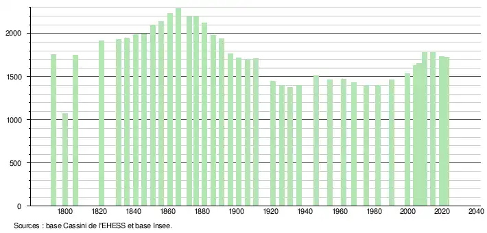 L'évolution du nombre d'habitants est connue à travers les recensements de la population effectués dans la commune depuis 1793. Pour les communes de moins de 10 000 habitants, une enquête de recensement portant sur toute la population est réalisée tous les cinq ans, les populations de référence des années intermédiaires étant quant à elles estimées par interpolation ou extrapolation[17]. Pour la commune, le premier recensement exhaustif entrant dans le cadre du nouveau dispositif a été réalisé en 2004[18].
