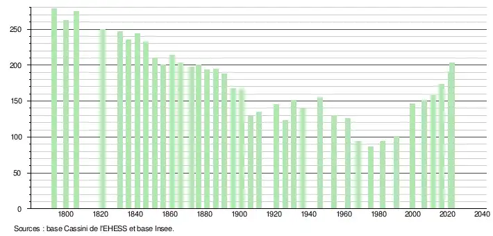 L'évolution du nombre d'habitants est connue à travers les recensements de la population effectués dans la commune depuis 1793. Pour les communes de moins de 10 000 habitants, une enquête de recensement portant sur toute la population est réalisée tous les cinq ans, les populations de référence des années intermédiaires étant quant à elles estimées par interpolation ou extrapolation[23]. Pour la commune, le premier recensement exhaustif entrant dans le cadre du nouveau dispositif a été réalisé en 2006[24].