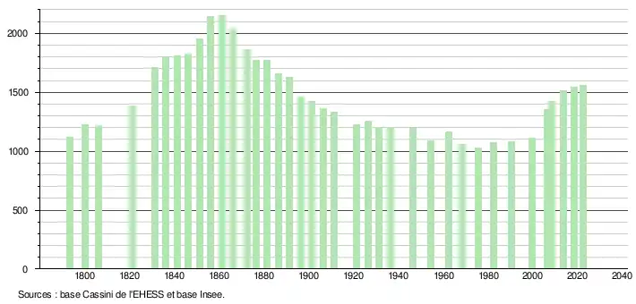 L'évolution du nombre d'habitants est connue à travers les recensements de la population effectués dans la commune depuis 1793. Pour les communes de moins de 10 000 habitants, une enquête de recensement portant sur toute la population est réalisée tous les cinq ans, les populations de référence des années intermédiaires étant quant à elles estimées par interpolation ou extrapolation[14]. Pour la commune, le premier recensement exhaustif entrant dans le cadre du nouveau dispositif a été réalisé en 2008[15].