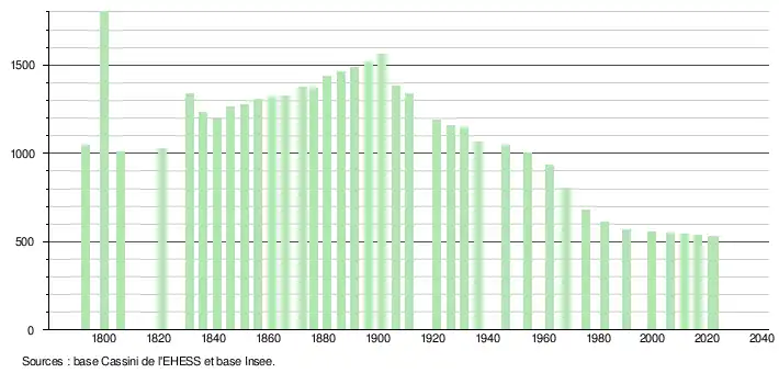 L'évolution du nombre d'habitants est connue à travers les recensements de la population effectués dans la commune depuis 1793. Pour les communes de moins de 10 000 habitants, une enquête de recensement portant sur toute la population est réalisée tous les cinq ans, les populations de référence des années intermédiaires étant quant à elles estimées par interpolation ou extrapolation[21]. Pour la commune, le premier recensement exhaustif entrant dans le cadre du nouveau dispositif a été réalisé en 2006[22].