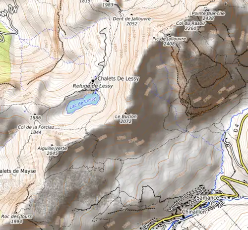 Il se trouve sur l'arête reliant le pic de Jallouvre au nord-est à l'aiguille Verte au sud-ouest, dominant le plateau de Samance et le Chinaillon au sud et le lac de Lessy au nord-ouest[1]. Son sommet constitué de calcaire urgonien n'est pas accessible à pied, les sentiers de randonnée restant sur les flancs de la montagne[1].