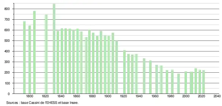 L'évolution du nombre d'habitants est connue à travers les recensements de la population effectués dans la commune depuis 1793. Pour les communes de moins de 10 000 habitants, une enquête de recensement portant sur toute la population est réalisée tous les cinq ans, les populations de référence des années intermédiaires étant quant à elles estimées par interpolation ou extrapolation[34]. Pour la commune, le premier recensement exhaustif entrant dans le cadre du nouveau dispositif a été réalisé en 2007[35].