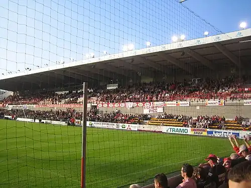 - ↑ Le terrain est en léger dénivelé, la tribune visiteur, au nord, est légèrement plus haute que la tribune Sud.