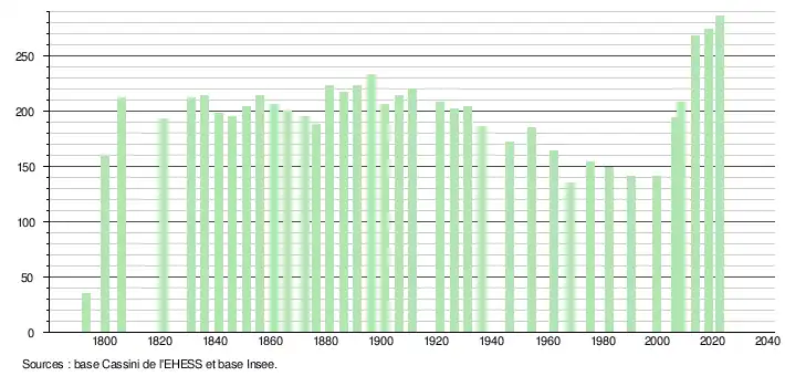 - ↑ Fiches Insee - Populations de référence de la commune pour les années 2006, 2007, 2008, 2009, 2010, 2011, 2012, 2013, 2014, 2015, 2016, 2017, 2018, 2019, 2020, 2021 et 2022.