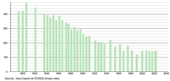 L'évolution du nombre d'habitants est connue à travers les recensements de la population effectués dans la commune depuis 1793. Pour les communes de moins de 10 000 habitants, une enquête de recensement portant sur toute la population est réalisée tous les cinq ans, les populations de référence des années intermédiaires étant quant à elles estimées par interpolation ou extrapolation[25]. Pour la commune, le premier recensement exhaustif entrant dans le cadre du nouveau dispositif a été réalisé en 2006[26].
