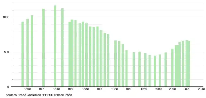 L'évolution du nombre d'habitants est connue à travers les recensements de la population effectués dans la commune depuis 1793. Pour les communes de moins de 10 000 habitants, une enquête de recensement portant sur toute la population est réalisée tous les cinq ans, les populations de référence des années intermédiaires étant quant à elles estimées par interpolation ou extrapolation[19]. Pour la commune, le premier recensement exhaustif entrant dans le cadre du nouveau dispositif a été réalisé en 2004[20].