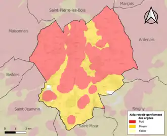 La commune est vulnérable au risque de mouvements de terrains constitué principalement du retrait-gonflement des sols argileux[16]. Cet aléa est susceptible d'engendrer des dommages importants aux bâtiments en cas d’alternance de périodes de sécheresse et de pluie. 99,3 % de la superficie communale est en aléa moyen ou fort (90 % au niveau départemental et 48,5 % au niveau national). Sur les 644 bâtiments dénombrés sur la commune en 2019, 644 sont en aléa moyen ou fort, soit 100 %, à comparer aux 83 % au niveau départemental et 54 % au niveau national. Une cartographie de l'exposition du territoire national au retrait gonflement des sols argileux est disponible sur le site du BRGM[17],[Carte 2].