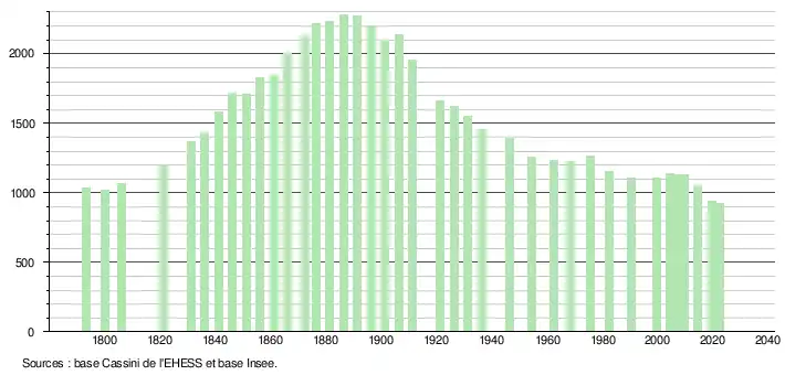 L'évolution du nombre d'habitants est connue à travers les recensements de la population effectués dans la commune depuis 1793. Pour les communes de moins de 10 000 habitants, une enquête de recensement portant sur toute la population est réalisée tous les cinq ans, les populations de référence des années intermédiaires étant quant à elles estimées par interpolation ou extrapolation[25]. Pour la commune, le premier recensement exhaustif entrant dans le cadre du nouveau dispositif a été réalisé en 2004[26].