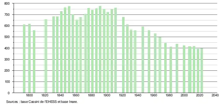 On peut relever des chiffres nettement supérieurs durant les siècles précédents : 612 en 1790 et un maximum de 777 en 1891.