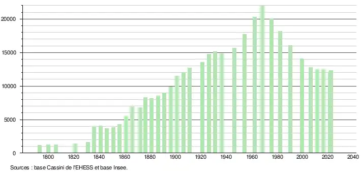 L'évolution du nombre d'habitants est connue à travers les recensements de la population effectués dans la commune depuis 1793. Pour les communes de plus de 10 000 habitants les recensements ont lieu chaque année à la suite d'une enquête par sondage auprès d'un échantillon d'adresses représentant 8 % de leurs logements, contrairement aux autres communes qui ont un recensement réel tous les cinq ans[40],[Note 4].