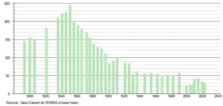 L'évolution du nombre d'habitants est connue à travers les recensements de la population effectués dans la commune depuis 1793. Pour les communes de moins de 10 000 habitants, une enquête de recensement portant sur toute la population est réalisée tous les cinq ans, les populations de référence des années intermédiaires étant quant à elles estimées par interpolation ou extrapolation[26]. Pour la commune, le premier recensement exhaustif entrant dans le cadre du nouveau dispositif a été réalisé en 2004[27].
