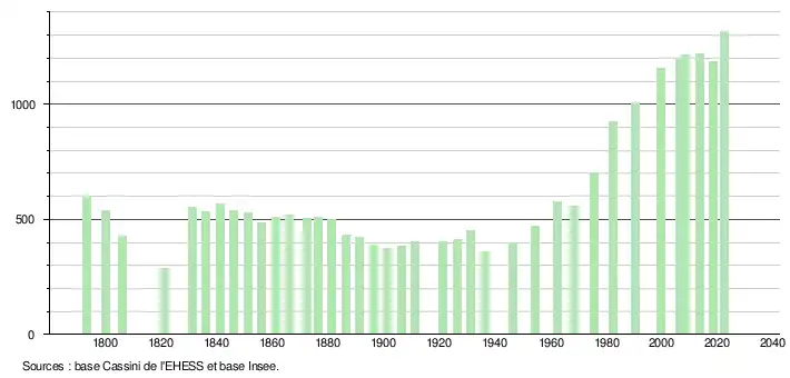 L'évolution du nombre d'habitants est connue à travers les recensements de la population effectués dans la commune depuis 1793. Pour les communes de moins de 10 000 habitants, une enquête de recensement portant sur toute la population est réalisée tous les cinq ans, les populations de référence des années intermédiaires étant quant à elles estimées par interpolation ou extrapolation[23]. Pour la commune, le premier recensement exhaustif entrant dans le cadre du nouveau dispositif a été réalisé en 2008[24].