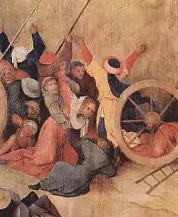 - Sous la roue droite, un homme à terre, au caque conique, robe longue rouge, barbe noire et cheveux frisés, est vautré sur une échelle. Sa tête repose sur un de ses bras replié, alors qu'au bout de son autre main se trouve du foin. Il semble avoir les yeux fermés, ce qui renforce la tension créée par la roue qui va lui broyer le cou.