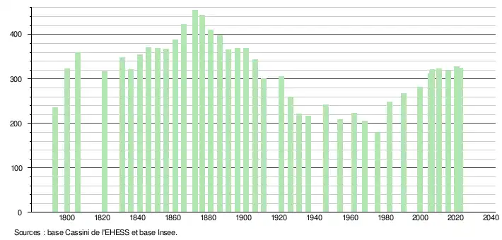 L'évolution du nombre d'habitants est connue à travers les recensements de la population effectués dans la commune depuis 1793. Pour les communes de moins de 10 000 habitants, une enquête de recensement portant sur toute la population est réalisée tous les cinq ans, les populations de référence des années intermédiaires étant quant à elles estimées par interpolation ou extrapolation[20]. Pour la commune, le premier recensement exhaustif entrant dans le cadre du nouveau dispositif a été réalisé en 2005[21].