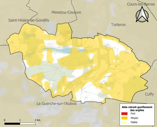 La commune est vulnérable au risque de mouvements de terrains constitué principalement du retrait-gonflement des sols argileux[13]. Cet aléa est susceptible d'engendrer des dommages importants aux bâtiments en cas d’alternance de périodes de sécheresse et de pluie. 73,3 % de la superficie communale est en aléa moyen ou fort (90 % au niveau départemental et 48,5 % au niveau national). Sur les 143 bâtiments dénombrés sur la commune en 2019, 110 sont en aléa moyen ou fort, soit 77 %, à comparer aux 83 % au niveau départemental et 54 % au niveau national. Une cartographie de l'exposition du territoire national au retrait gonflement des sols argileux est disponible sur le site du BRGM[14],[Carte 2].