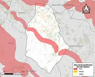 Le retrait-gonflement des sols argileux est susceptible d'engendrer des dommages importants aux bâtiments en cas d’alternance de périodes de sécheresse et de pluie. 12,5 % de la superficie communale est en aléa moyen ou fort (54,2 % au niveau départemental et 48,5 % au niveau national). Sur les 402 bâtiments dénombrés sur la commune en 2019, 76 sont en aléa moyen ou fort, soit 19 %, à comparer aux 57 % au niveau départemental et 54 % au niveau national. Une cartographie de l'exposition du territoire national au retrait gonflement des sols argileux est disponible sur le site du BRGM[33],[Carte 2].