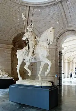 Il s’agit d’un groupe en plâtre : le chevalier est assis sur sa selle, ses solerets à poulaine parés d’éperons, bien enfoncé dans ses étriers. Il a le regard levé, le torse bombé, revêtu d’une armure de style médiévale, il tient les rênes de sa main gauche et une main de justice dans la droite. Son heaume ouvert laisse voir son visage barbu, sur sa tête est posée une couronne de laurier. Il est armé d’une épée à sa ceinture et d’une lance avec son oriflamme dans le dos.