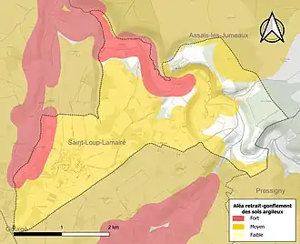 Les mouvements de terrains susceptibles de se produire sur la commune sont des tassements différentiels[15]. Le retrait-gonflement des sols argileux est susceptible d'engendrer des dommages importants aux bâtiments en cas d’alternance de périodes de sécheresse et de pluie[16]. 78,8 % de la superficie communale est en aléa moyen ou fort (54,9 % au niveau départemental et 48,5 % au niveau national)[Carte 2]. Depuis le , en application de la loi ELAN, différentes contraintes s'imposent aux vendeurs, maîtres d'ouvrages ou constructeurs de biens situés dans une zone classée en aléa moyen ou fort[Note 1],[17].