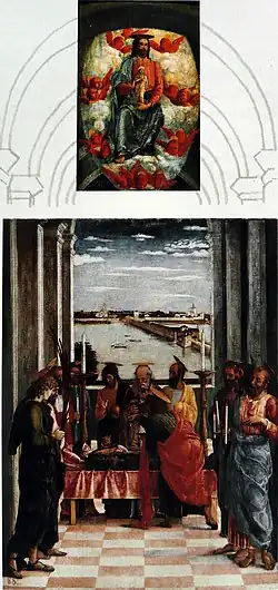 Avant 1926, Roberto Longhi découvre le panneau du Christ avec l'âme de la Vierge dans une collection privée de Ferrare, considéré alors comme une œuvre de Vittore Carpaccio[4]. Il l'identifie avec la partie supérieure de La Mort de la Vierge et reconstitue idéalement le tableau d'origine, dont les dimensions sont ainsi identiques aux deux panneaux latéraux du Triptyque des Offices, L'Ascension et La Circoncision.