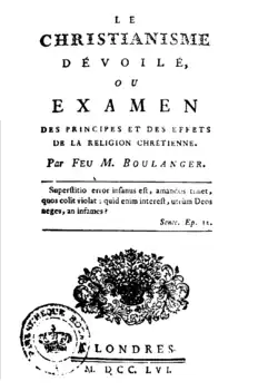 - Holbach, Le christianisme dévoilé, ou examen des principes et des effets de la religion chrétienne : par feu M. Boulanger, Londres, MDCCLVI, . Bibliothèque Nationale de France Cotes D2-5305, D2-5306. La date de la cote D2-5305 est corrigée à la main en 1766. Texte en ligne dans Holbach 1766