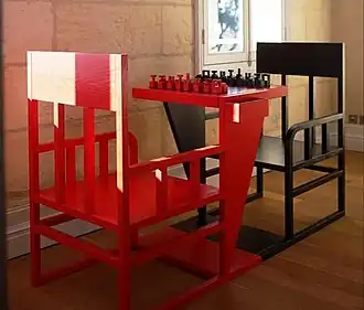 La deuxième table du set était la table d'échecs. Rodtchenko considérait les échecs comme un élément indispensable du passe-temps culturel du prolétariat, contribuant à son développement intellectuel. L’échiquier pouvait être tourné horizontalement pour changer la couleur attribuée au joueur au début d'une nouvelle partie, sans que les joueurs n’aient à se lever de table. Les deux chaises destinées aux joueurs d'échecs munies d'accoudoirs et de dossiers rectangulaires, constitués de quatre planches verticales parallèles et d'une traverse supérieure horizontale. Les pieds rectangulaires, sur lesquels elles étaient montées, s'emboitaient sous le plateau d'échiquier, exactement en son milieu[8],[4],[1].