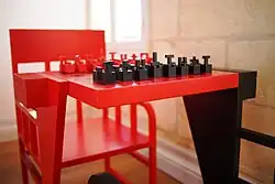 En outre, l'ensemble comprenait deux présentoirs à livres munies de cinq étagères inclinées, sans vitrage, et de tiroirs sur le niveau inférieur, qui pouvaient être convertis en petites tables ou en caissons. Un autre élément de l'intérieur était un présentoir d'une conception spécifique : ses trois tambours rotatifs horizontaux permettaient d'exposer alternativement différents contenus visuels[4],[1].