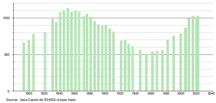 L'évolution du nombre d'habitants est connue à travers les recensements de la population effectués dans la commune depuis 1793. Pour les communes de moins de 10 000 habitants, une enquête de recensement portant sur toute la population est réalisée tous les cinq ans, les populations de référence des années intermédiaires étant quant à elles estimées par interpolation ou extrapolation[13]. Pour la commune, le premier recensement exhaustif entrant dans le cadre du nouveau dispositif a été réalisé en 2005[14].