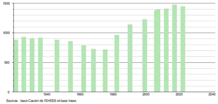 L'évolution du nombre d'habitants est connue à travers les recensements de la population effectués dans la commune depuis 1921. Pour les communes de moins de 10 000 habitants, une enquête de recensement portant sur toute la population est réalisée tous les cinq ans, les populations de référence des années intermédiaires étant quant à elles estimées par interpolation ou extrapolation[32]. Pour la commune, le premier recensement exhaustif entrant dans le cadre du nouveau dispositif a été réalisé en 2007[33].