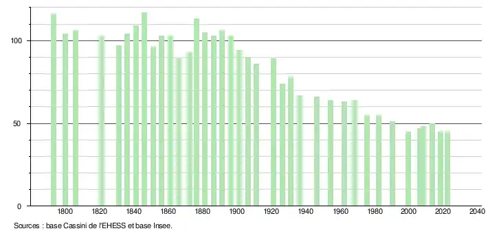 L'évolution du nombre d'habitants est connue à travers les recensements de la population effectués dans la commune depuis 1793. Pour les communes de moins de 10 000 habitants, une enquête de recensement portant sur toute la population est réalisée tous les cinq ans, les populations de référence des années intermédiaires étant quant à elles estimées par interpolation ou extrapolation[12]. Pour la commune, le premier recensement exhaustif entrant dans le cadre du nouveau dispositif a été réalisé en 2008[13].