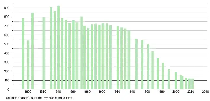 L'évolution du nombre d'habitants est connue à travers les recensements de la population effectués dans la commune depuis 1793. Pour les communes de moins de 10 000 habitants, une enquête de recensement portant sur toute la population est réalisée tous les cinq ans, les populations de référence des années intermédiaires étant quant à elles estimées par interpolation ou extrapolation[14]. Pour la commune, le premier recensement exhaustif entrant dans le cadre du nouveau dispositif a été réalisé en 2008[15].