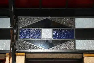 Les mêmes motifs floraux se répètent sur les vitraux qui ornent les baies d'imposte des portes situées à l'extrême gauche et à l'extrême droite de la façade.