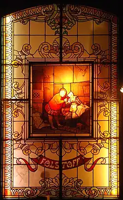 Le mur du fond de cette salle est orné de trois vitraux riches en couleurs représentant John Falstaff.