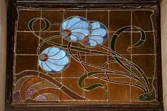 Les écoinçons de ces boiseries circulaires sont ornés de remarquables vitraux représentant des fleurs bleues aux feuillages sinueux typiques de la ligne en coup de fouet qui caractérise l'Art nouveau.