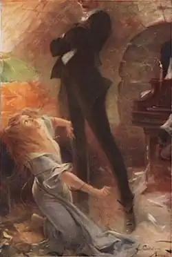Grimé en masque de la mort rouge à l'occasion d'un bal costumé, Erik le Fantôme descend le grand escalier de l'opéra Garnier. Il y « apparaît avec son véritable visage, défiant les personnages masqués de sa laideur dévoilée[1]. » Aquarelle d'André Castaigne en frontispice de la première édition américaine du roman (1911)[2]. | |