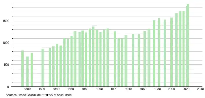 L'évolution du nombre d'habitants est connue à travers les recensements de la population effectués dans la commune depuis 1793. Pour les communes de moins de 10000habitants, une enquête de recensement portant sur toute la population est réalisée tous les cinqans, les populations de référence des années intermédiaires étant quant à elles estimées par interpolation ou extrapolation[108]. Pour la commune, le premier recensement exhaustif entrant dans le cadre du nouveau dispositif a été réalisé en 2006[109].