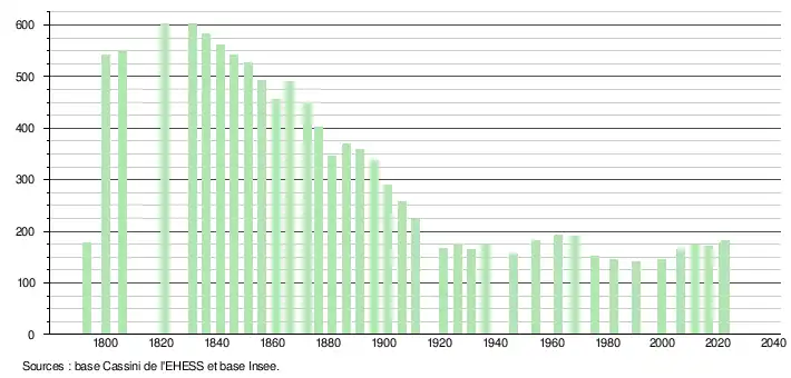 L'évolution du nombre d'habitants est connue à travers les recensements de la population effectués dans la commune depuis 1793. Pour les communes de moins de 10 000 habitants, une enquête de recensement portant sur toute la population est réalisée tous les cinq ans, les populations de référence des années intermédiaires étant quant à elles estimées par interpolation ou extrapolation[19]. Pour la commune, le premier recensement exhaustif entrant dans le cadre du nouveau dispositif a été réalisé en 2006[20].