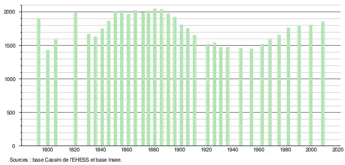 L'évolution du nombre d'habitants est connue à travers les recensements de la population effectués dans la commune depuis 1793. À partir du , les populations légales des communes sont publiées annuellement dans le cadre d'un recensement qui repose désormais sur une collecte d'information annuelle, concernant successivement tous les territoires communaux au cours d'une période de cinq ans. Pour les communes de moins de 10 000 habitants, une enquête de recensement portant sur toute la population est réalisée tous les cinq ans, les populations légales des années intermédiaires étant quant à elles estimées par interpolation ou extrapolation[14]. Pour la commune, le premier recensement exhaustif entrant dans le cadre du nouveau dispositif a été réalisé en 2008[15],[Note 1].