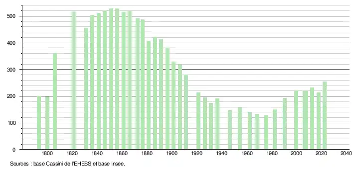 L'évolution du nombre d'habitants est connue à travers les recensements de la population effectués dans la commune depuis 1793. Pour les communes de moins de 10 000 habitants, une enquête de recensement portant sur toute la population est réalisée tous les cinq ans, les populations de référence des années intermédiaires étant quant à elles estimées par interpolation ou extrapolation[27]. Pour la commune, le premier recensement exhaustif entrant dans le cadre du nouveau dispositif a été réalisé en 2007[28].
