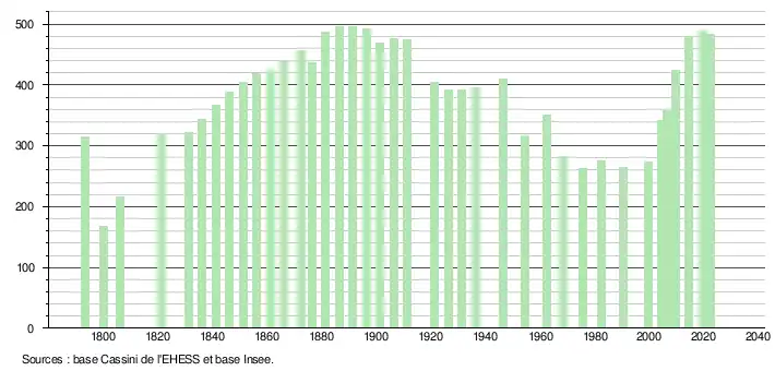 L'évolution du nombre d'habitants est connue à travers les recensements de la population effectués dans la commune depuis 1793. Pour les communes de moins de 10 000 habitants, une enquête de recensement portant sur toute la population est réalisée tous les cinq ans, les populations de référence des années intermédiaires étant quant à elles estimées par interpolation ou extrapolation[29]. Pour la commune, le premier recensement exhaustif entrant dans le cadre du nouveau dispositif a été réalisé en 2004[30].