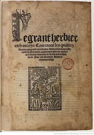 Son titre complet est Le grant herbier en francoys Contenant les qualitez Vertus & proprietez des herbes Arbres Gommes & Semences. Extraict de plusieurs traictez de medecine Comme de Avicenne de Rasis de Constantin de Isaac & de Plataire. Selon le commun usage[1].