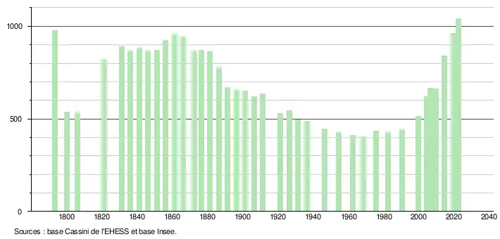L'évolution du nombre d'habitants est connue à travers les recensements de la population effectués dans la commune depuis 1793. Pour les communes de moins de 10 000 habitants, une enquête de recensement portant sur toute la population est réalisée tous les cinq ans, les populations de référence des années intermédiaires étant quant à elles estimées par interpolation ou extrapolation[14]. Pour la commune, le premier recensement exhaustif entrant dans le cadre du nouveau dispositif a été réalisé en 2004[15].
