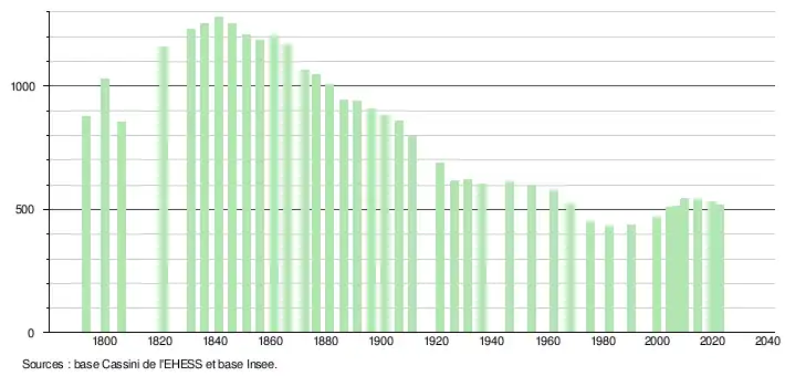 L'évolution du nombre d'habitants est connue à travers les recensements de la population effectués dans la commune depuis 1793. Pour les communes de moins de 10 000 habitants, une enquête de recensement portant sur toute la population est réalisée tous les cinq ans, les populations de référence des années intermédiaires étant quant à elles estimées par interpolation ou extrapolation[17]. Pour la commune, le premier recensement exhaustif entrant dans le cadre du nouveau dispositif a été réalisé en 2004[18].