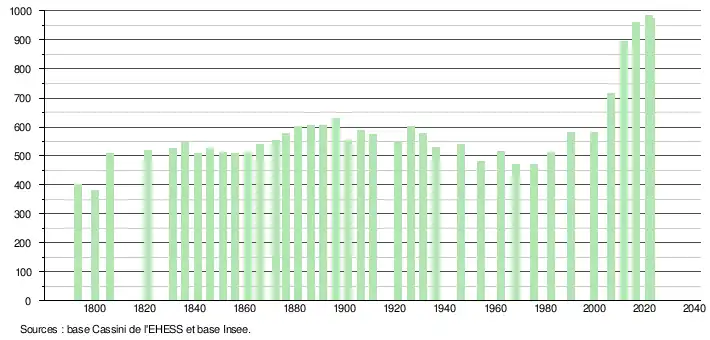 L'évolution du nombre d'habitants est connue à travers les recensements de la population effectués dans la commune depuis 1793. Pour les communes de moins de 10 000 habitants, une enquête de recensement portant sur toute la population est réalisée tous les cinq ans, les populations de référence des années intermédiaires étant quant à elles estimées par interpolation ou extrapolation[18]. Pour la commune, le premier recensement exhaustif entrant dans le cadre du nouveau dispositif a été réalisé en 2006[19].