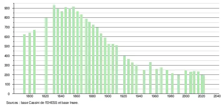 L'évolution du nombre d'habitants est connue à travers les recensements de la population effectués dans la commune depuis 1793. Pour les communes de moins de 10 000 habitants, une enquête de recensement portant sur toute la population est réalisée tous les cinq ans, les populations de référence des années intermédiaires étant quant à elles estimées par interpolation ou extrapolation[25]. Pour la commune, le premier recensement exhaustif entrant dans le cadre du nouveau dispositif a été réalisé en 2005[26].