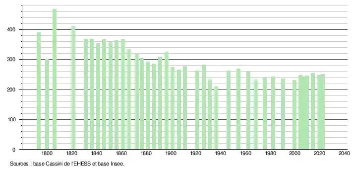 L'évolution du nombre d'habitants est connue à travers les recensements de la population effectués dans la commune depuis 1793. Pour les communes de moins de 10 000 habitants, une enquête de recensement portant sur toute la population est réalisée tous les cinq ans, les populations de référence des années intermédiaires étant quant à elles estimées par interpolation ou extrapolation[26]. Pour la commune, le premier recensement exhaustif entrant dans le cadre du nouveau dispositif a été réalisé en 2004[27].