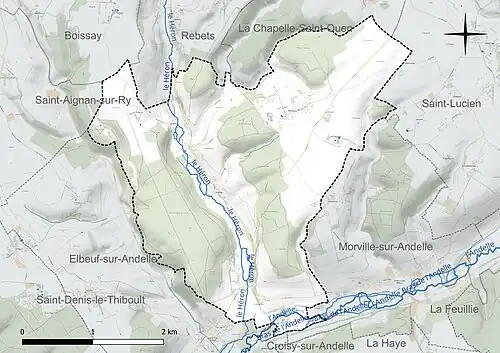 Les communes limitrophes sont Boissay, Croisy-sur-Andelle, Elbeuf-sur-Andelle, La Chapelle-Saint-Ouen, Rebets, Saint-Aignan-sur-Ry, Saint-Lucien et Sigy-en-Bray.