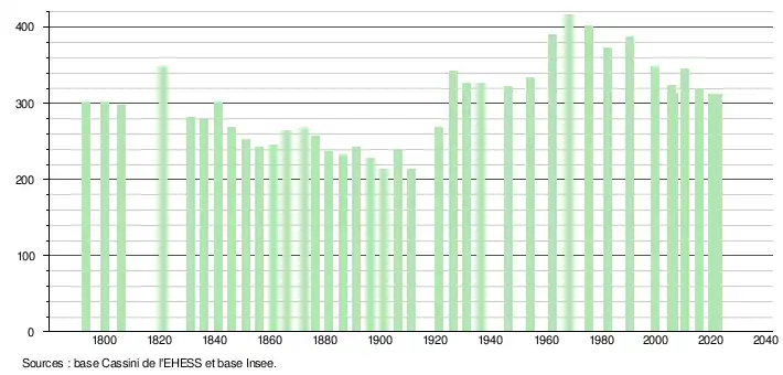 L'évolution du nombre d'habitants est connue à travers les recensements de la population effectués dans la commune depuis 1793. Pour les communes de moins de 10 000 habitants, une enquête de recensement portant sur toute la population est réalisée tous les cinq ans, les populations de référence des années intermédiaires étant quant à elles estimées par interpolation ou extrapolation[32]. Pour la commune, le premier recensement exhaustif entrant dans le cadre du nouveau dispositif a été réalisé en 2005[33].